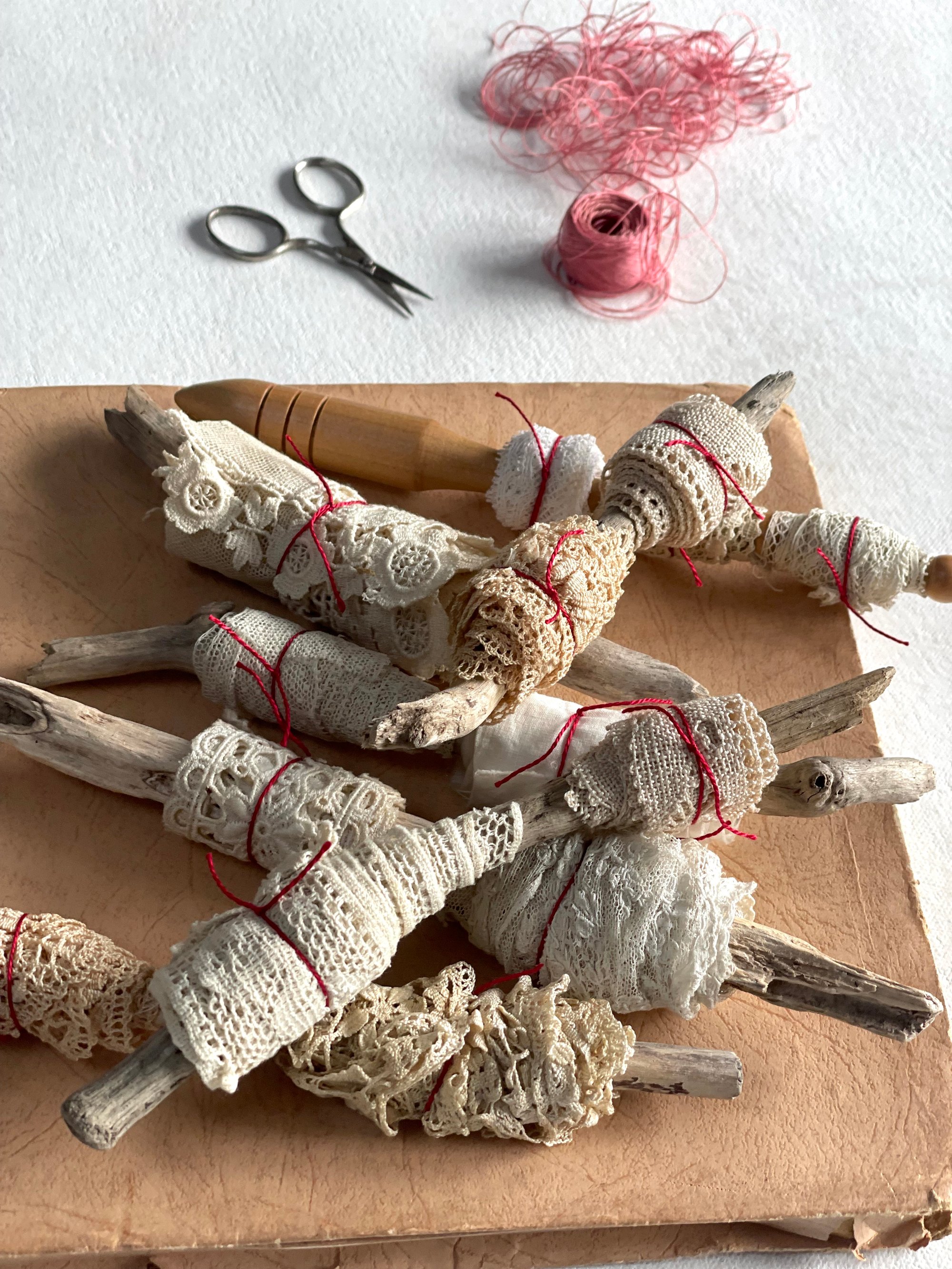 I just have a few of these beautiful pieces of odd lace left.From my studio design archive,Lace are wound on to a stick or lace bobbin.Its a lucky dip what I will send you.Jessie Chorley