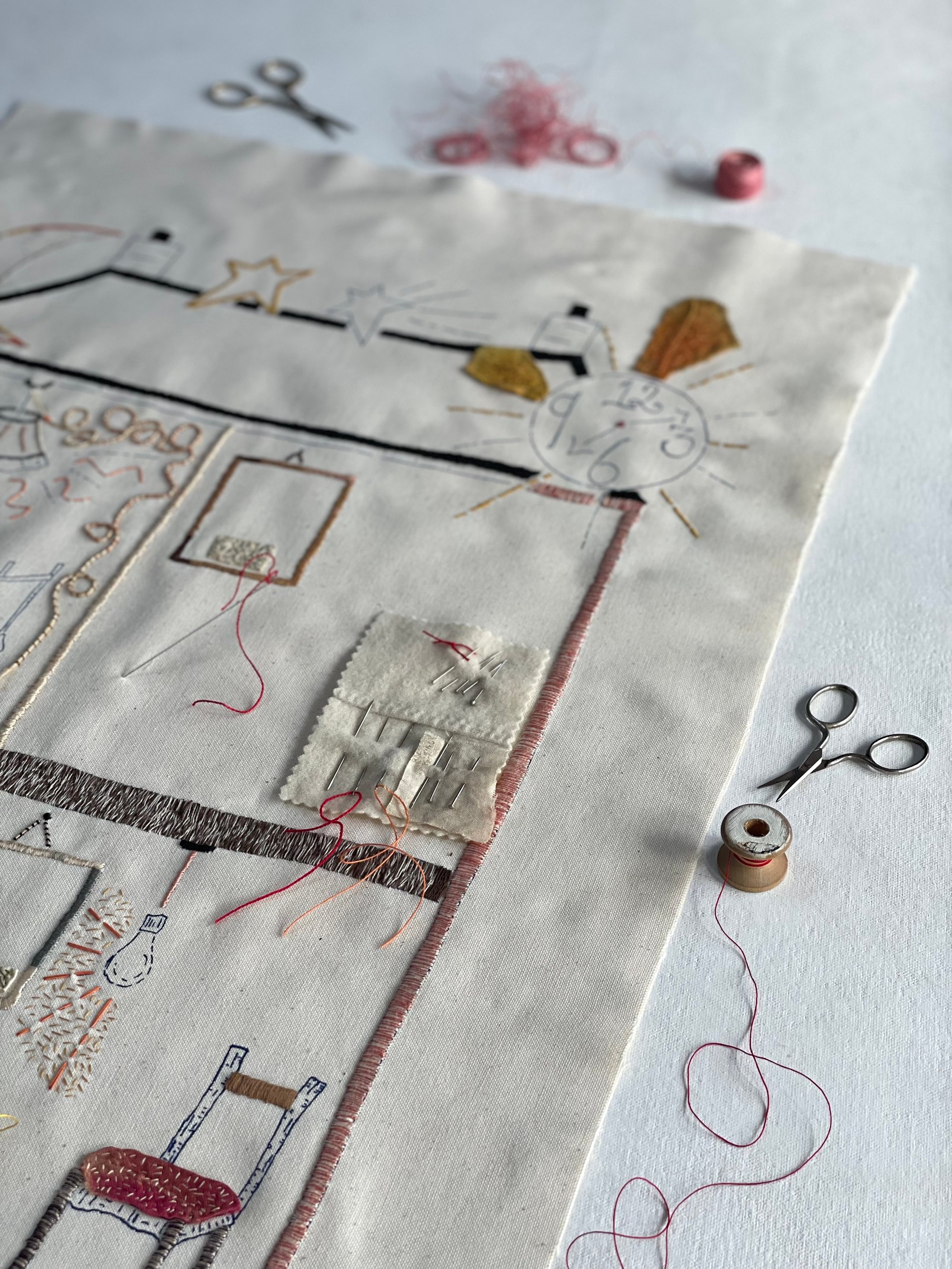 The design, printed in my favourite shade of blue ink, celebrates two of my favourite techniques, hand stitching and fine needle-turned appliqué. I hope that you too can find joy in the process of slow stitching and making marks with your needles, threads and fabrics to create your own unique stitched story.
